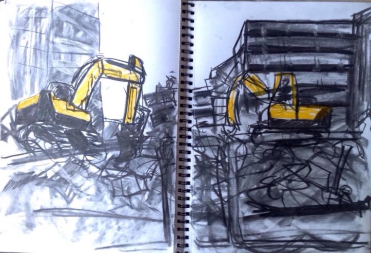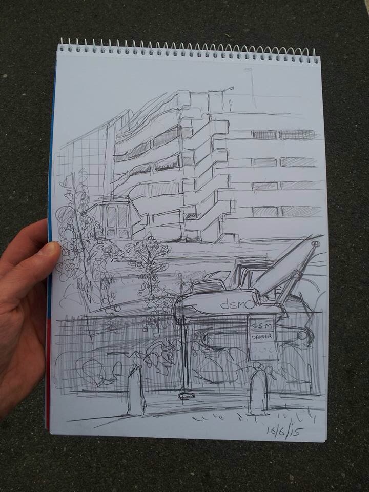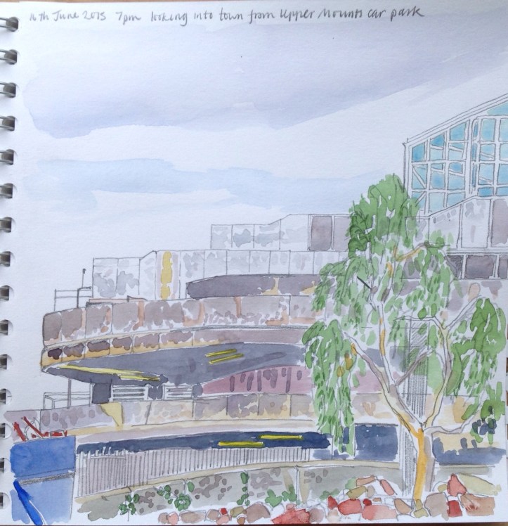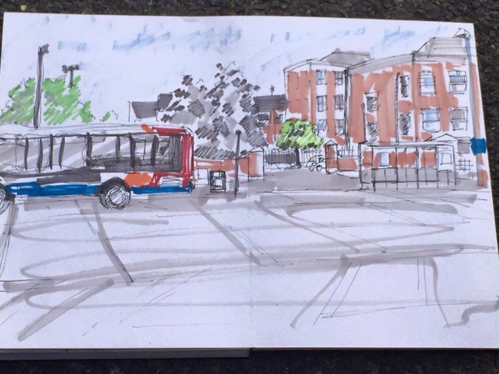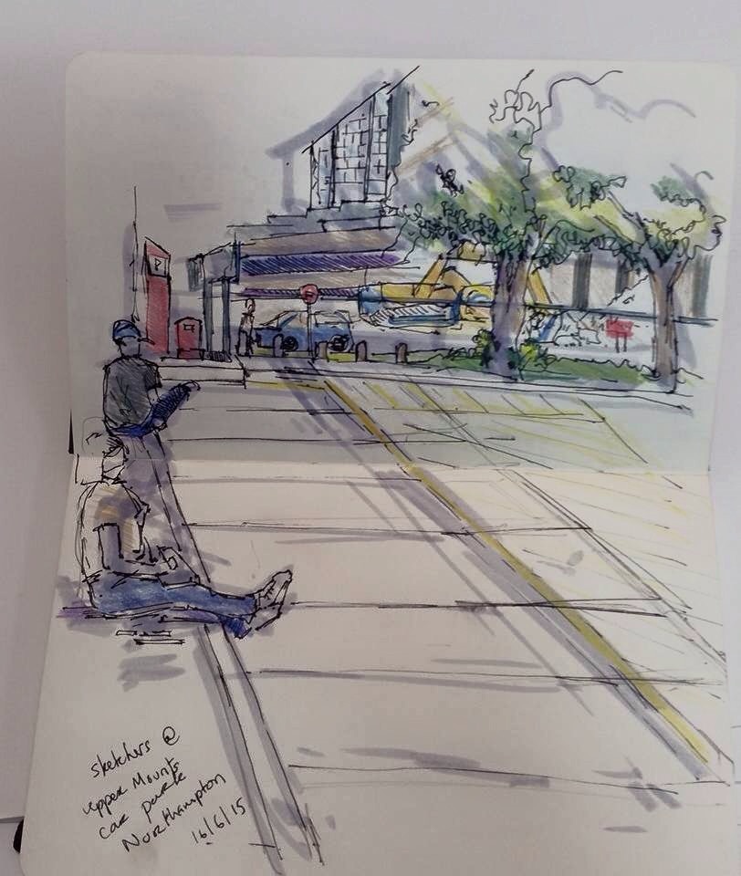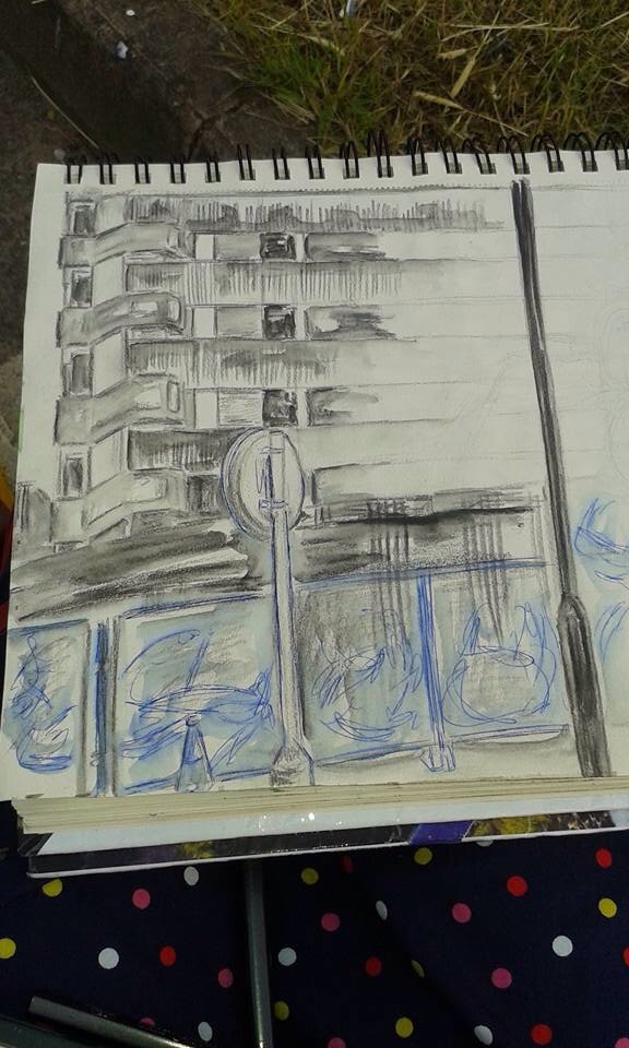 From here we could see the fire station, Mounts baths, Holy Sepulchre Church, the rubble that was the bus station and there was lots to see and draw. The car park was quiet, very few cars so a really good view and plenty of space. It was a surprisingly good location and was also the first evening we felt warm! It was our twelfth meeting.