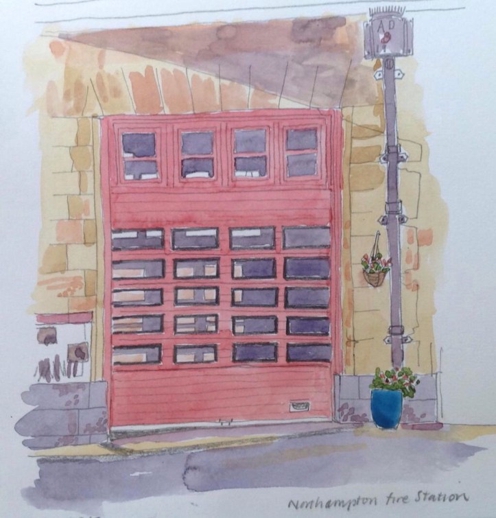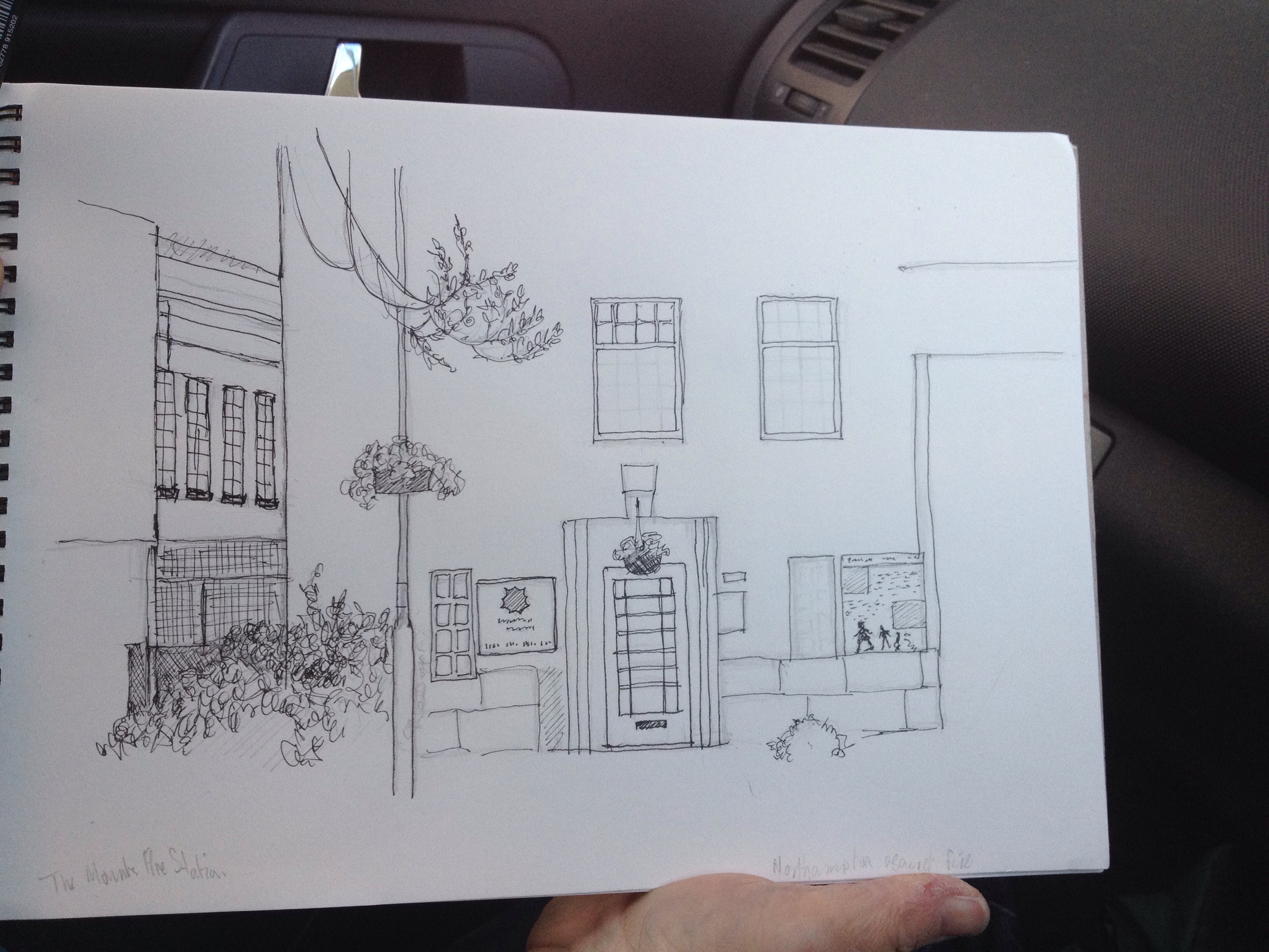 What was it like? It was bright but very windy so we sat in the car to draw. We faced the car towards the fire station this time. Whilst we drew an abandoned car in the space next to us was towed away!