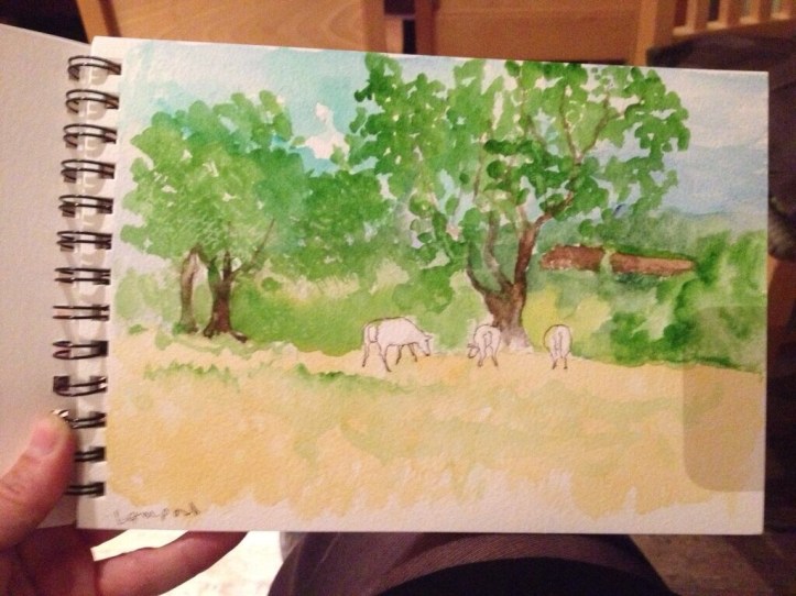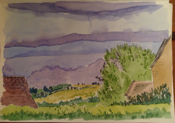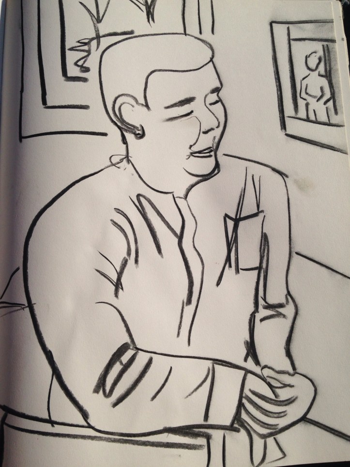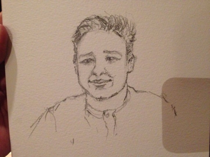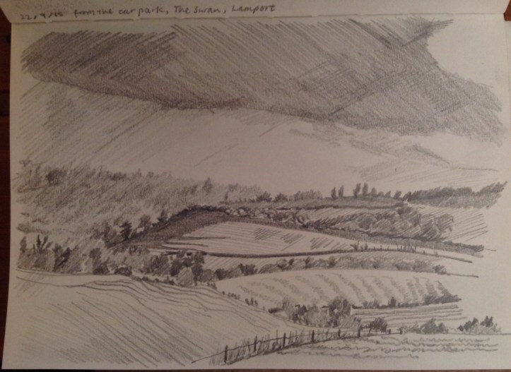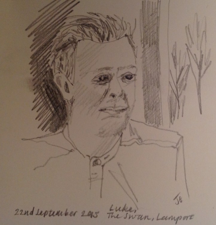 What was it like? We started outside, some of us drawing from our cars and some from the pub garden. The weather was so dramatic and changeable – we saw rain, cloud, mist, rainbows, clear blue sky, pink and purple clouds and wonderful sunset in about half an hour. When we went in the staff at The Swan were so we,coming and we were able to draw views from the window until it went dark. Luke, one of the staff even posed for us for ten minutes and we had a go at portraiture!