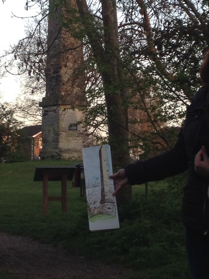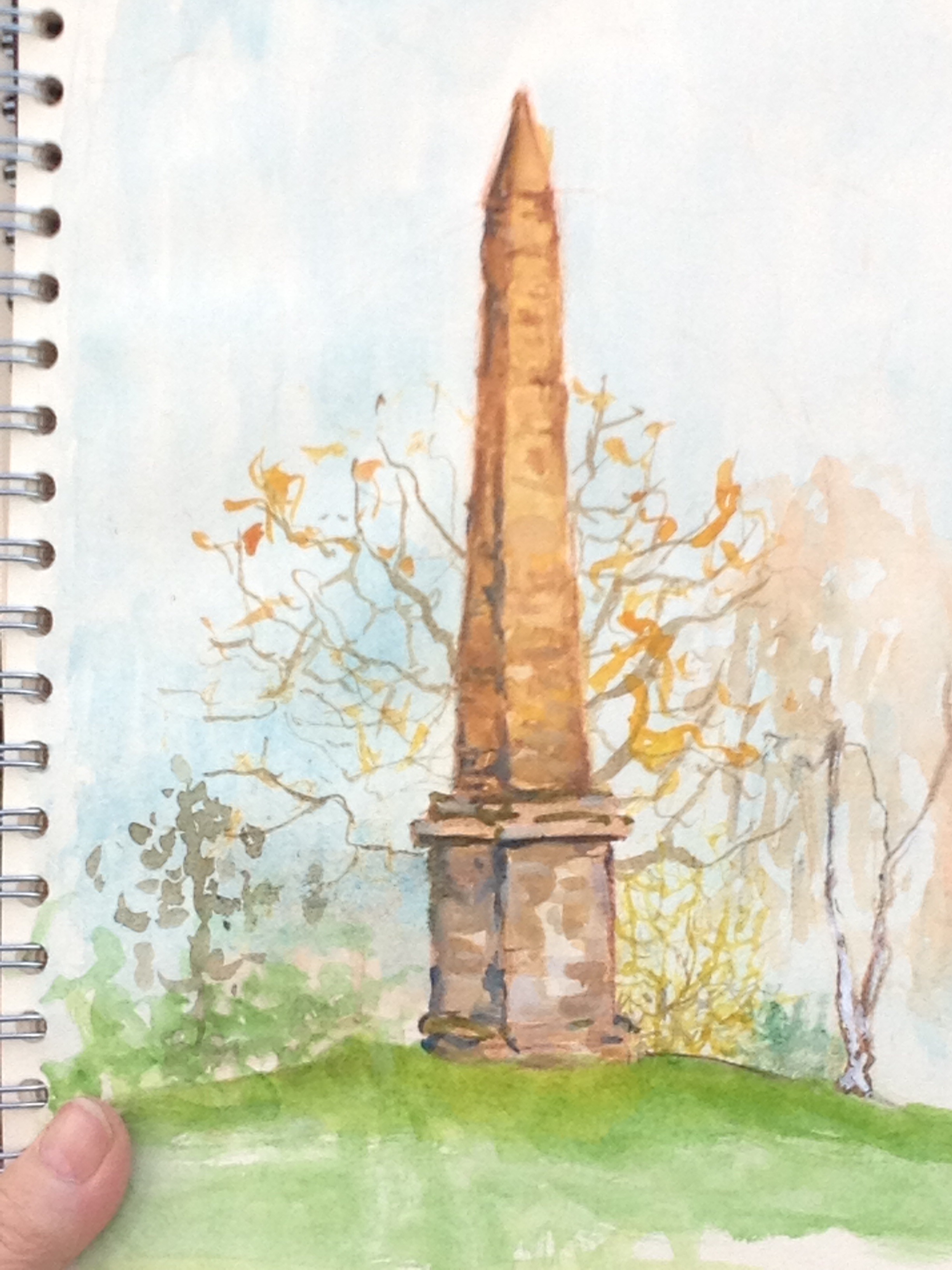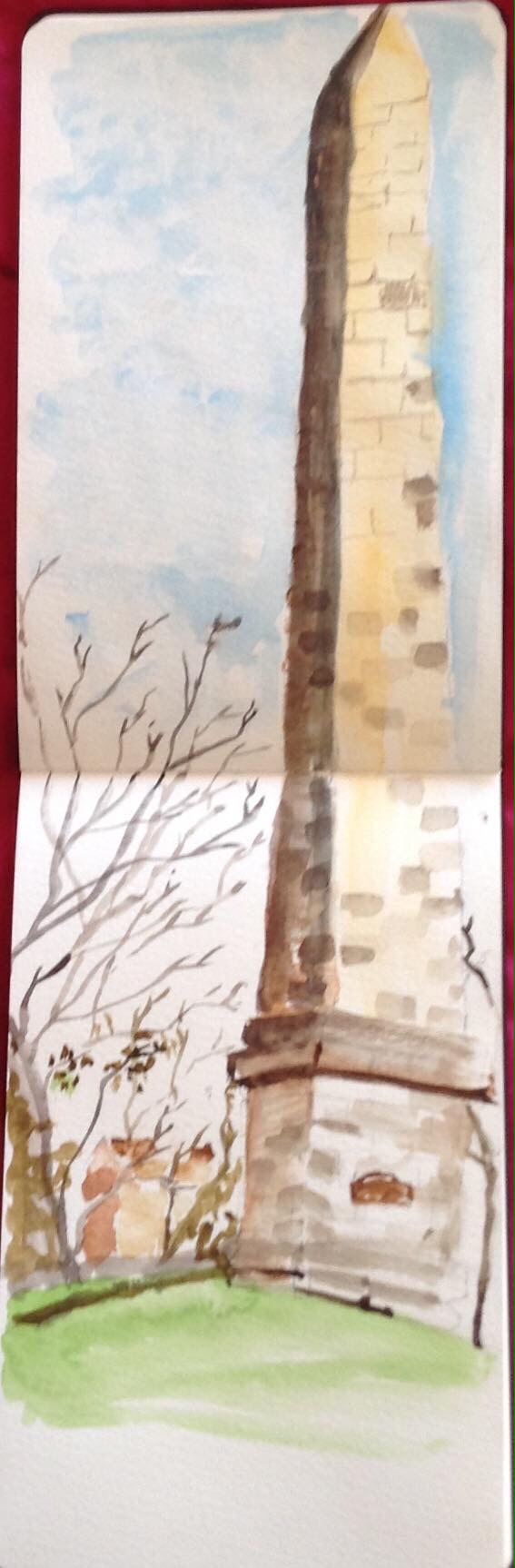 What was it like? Another blue clear evening though still very cold. The obelisk is tucked away in a pocket park, so lots of birdsong. Behind us there was a lovely sunset.