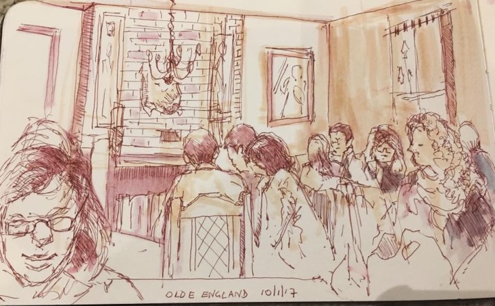 January 12, 2017July 13, 2019jeandrawingaday Tuesday 10th January Who came? Anne, Jane, Jean, Jo, Lorraine, Minnie Where did we go? The Olde England, Kettering Road What was it like? A great atmosphere, tables to draw and paint at, beer or coffee readily available – a really good winter location. Share this: Email a link to a friend (Opens in new window) Email Share on X (Opens in new window) X Share on Facebook (Opens in new window) Facebook Share on Pocket (Opens in new window) Pocket Share on Pinterest (Opens in new window) Pinterest Print (Opens in new window) Print Like Loading...