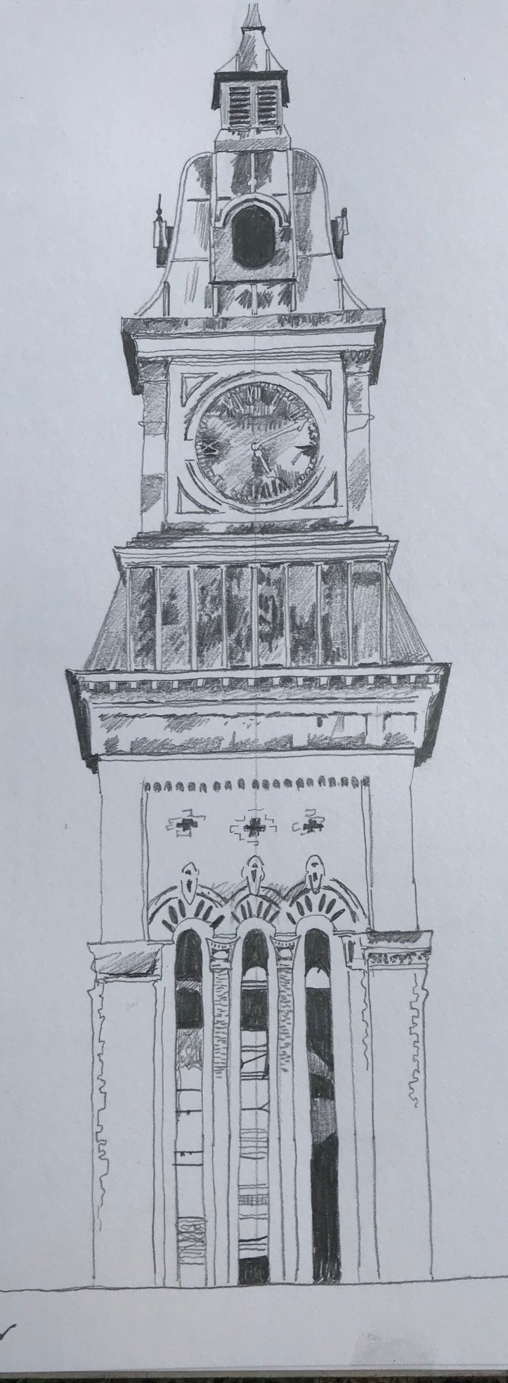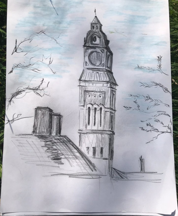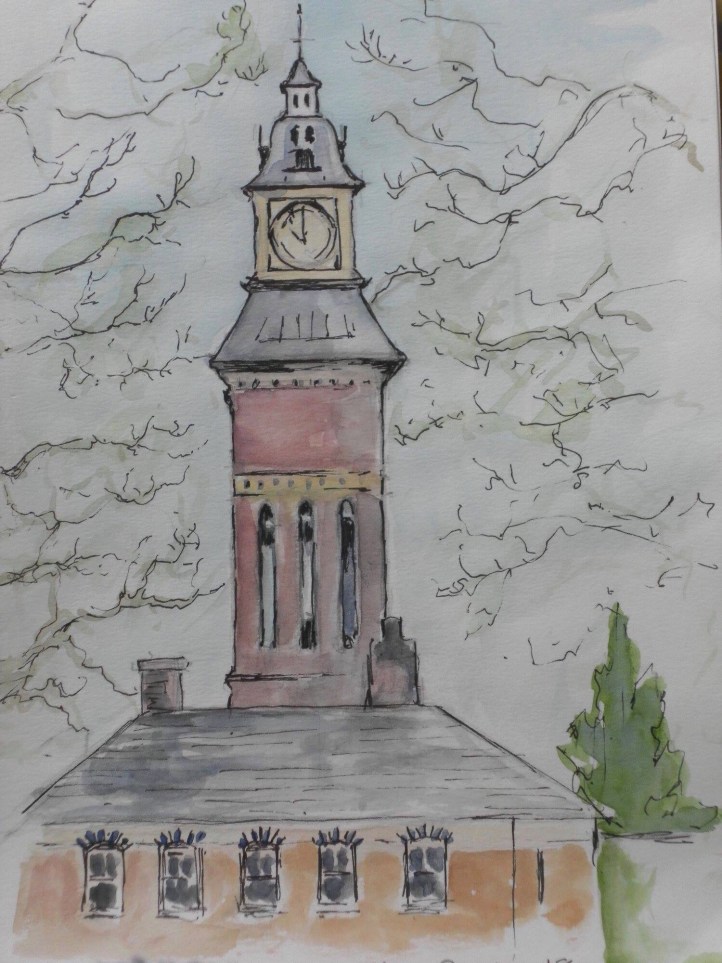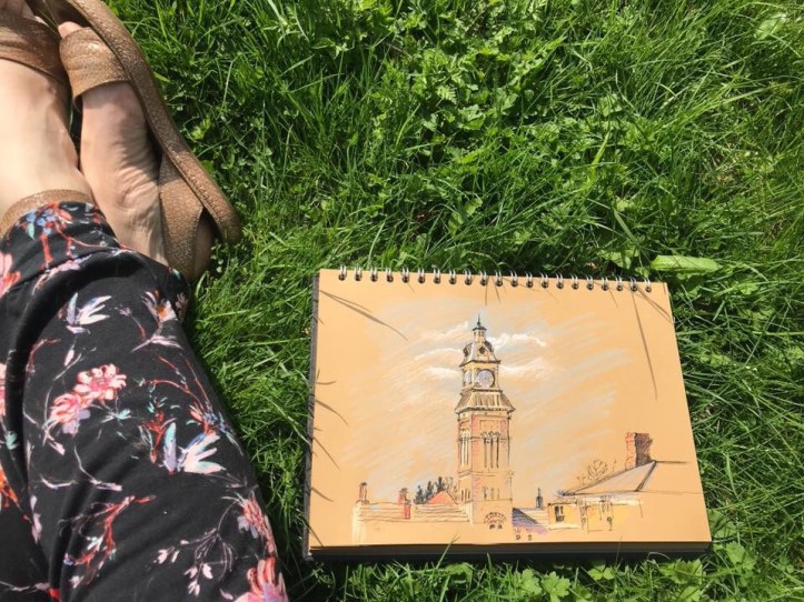 What was it like? We were lucky that it was still warm and sunny in the morning so it was lovely to sit outside and sketch. There were children playing on the green, some came to look and they loved Jo’s dog, Chester! It would be good to go back in the evening when the sunlight is at a different angle.