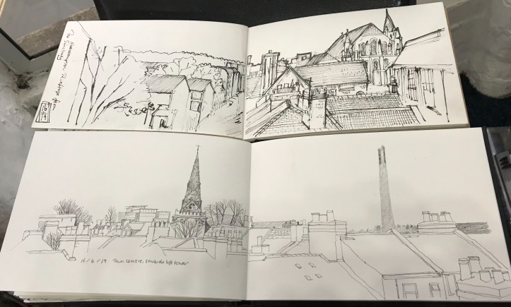 What was it like? Much easier to sketch the panoramic view as the there was no sun, a fuzzy haze of approaching rain instead!