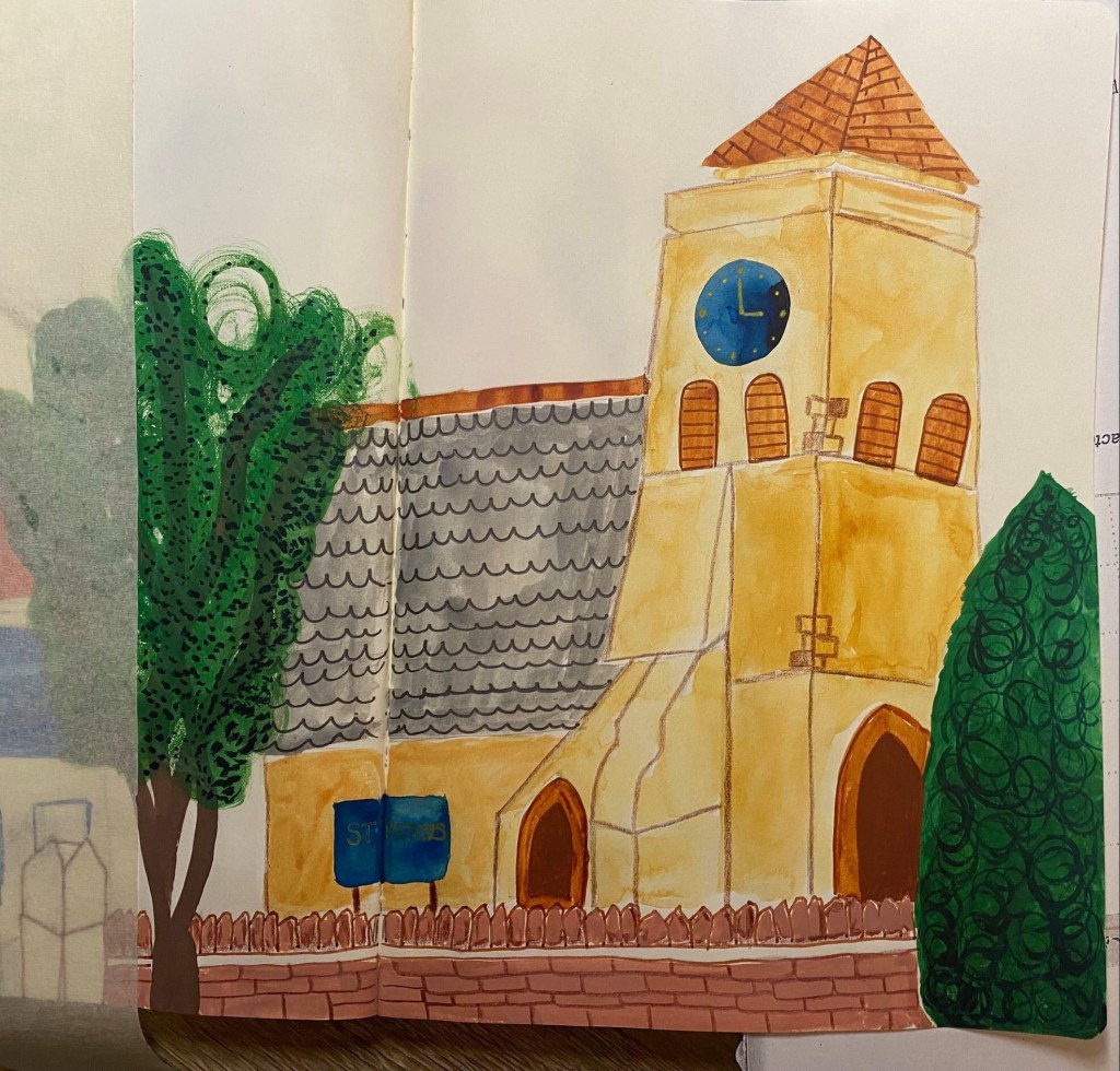 What was it like? It was a beautifully sunny afternoon and there is a piece of grass, walled off, Peter’s Piece, which made a great place to sit and sketch from.