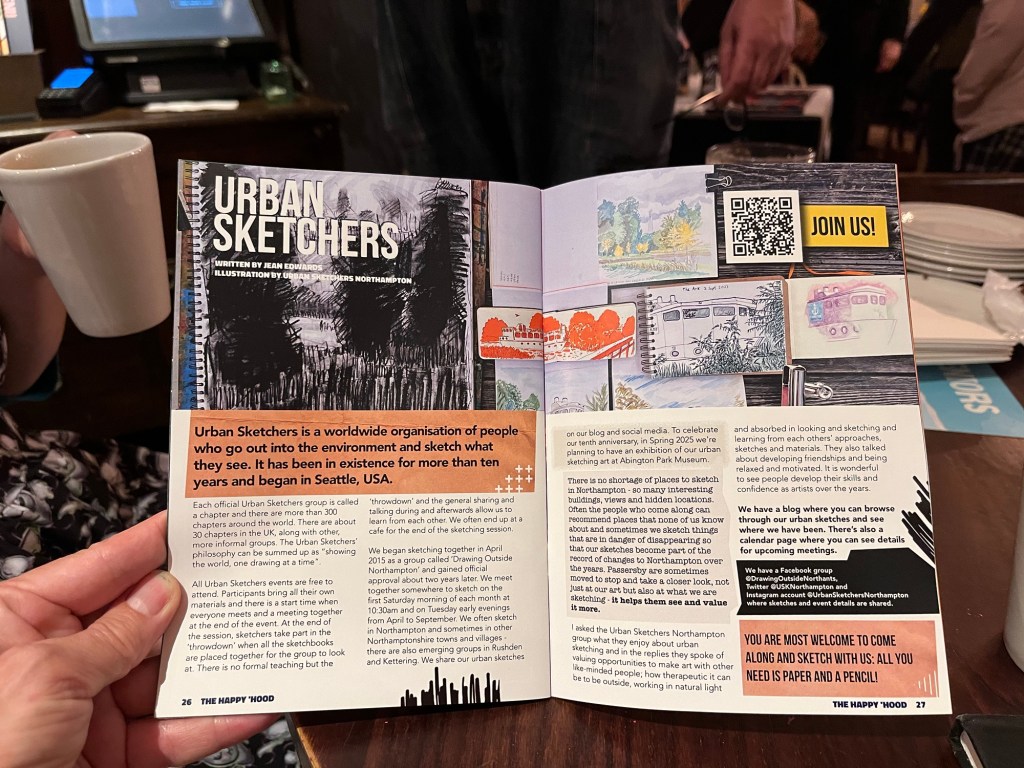 April 7, 2024April 7, 2024jeandrawingaday October 2024 This month Urbansketchers Northampton was in The Happy Hood. Share this: Email a link to a friend (Opens in new window) Email Share on X (Opens in new window) X Share on Facebook (Opens in new window) Facebook Share on Pocket (Opens in new window) Pocket Share on Pinterest (Opens in new window) Pinterest Print (Opens in new window) Print Like Loading...