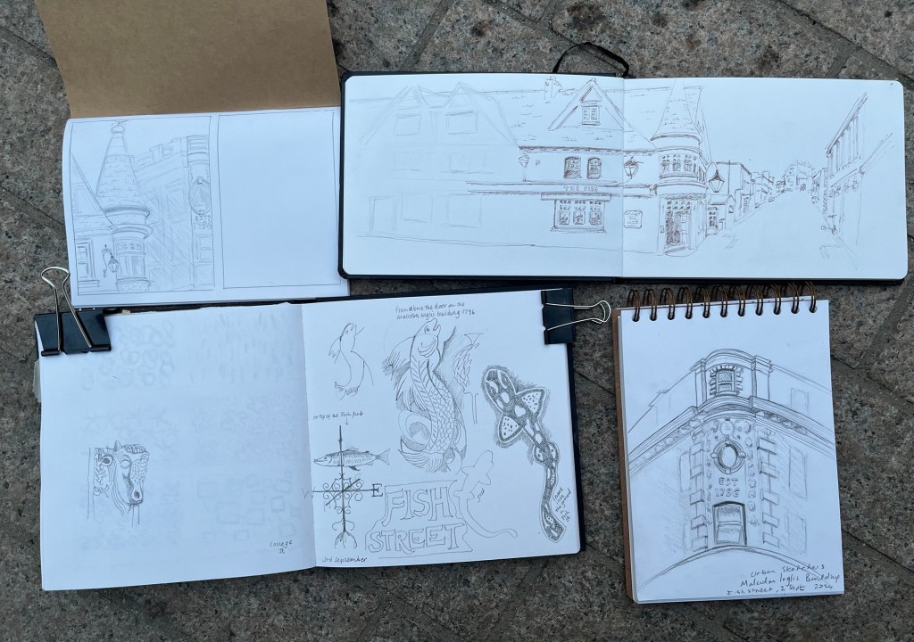 What was it like? After a dull and rainy day the skies cleared and it was sunny. Lots to sketch in Fish St, including some very old buildings and some challenging perspective.