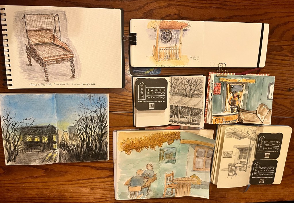 1 day ago March 14, 2026March 14, 2026jeandrawingaday 24th February 26 Towcester Mill Brewery Where did we go? Towcester Mill Brewery Who came? seven urbansketchers including Jean, Jenny, Steve, Kevin, Susan and Nicki. What was it like? A great place to sketch – lots of space and a lovely atmosphere. We’ll definitely return on the daylight. Share this: Email a link to a friend (Opens in new window) Email Share on X (Opens in new window) X Share on Facebook (Opens in new window) Facebook Share on Pinterest (Opens in new window) Pinterest Print (Opens in new window) Print Like Loading...
